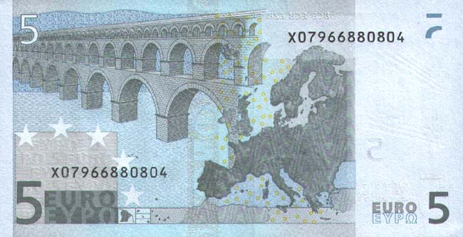 Это не римский акведук Пон-Дю-Гар, художники купюры напутали с опорами. Второй ярус они сдвинули почему то. В действительности опоры второго яруса опираются на опоры первого.. Так что на купюре лажа.